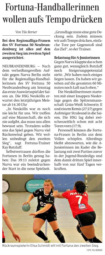 Nordkurier 04.10.2025: Fortuna-Handballerinnen wollen aufs Tempo drücken
