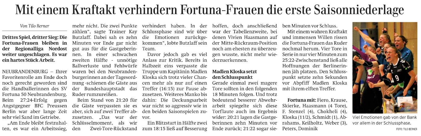Nordkurier 13.10.2025: Mit einem Kraftakt verhindern Fortuna-Frauen die erste Saisonniederlage