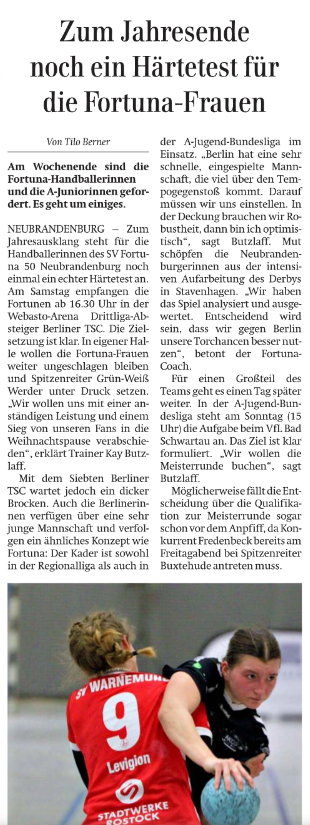 Nordkurier 19.12.2025: Zum Jahresende noch ein Härtetest für die Fortuna-Frauen