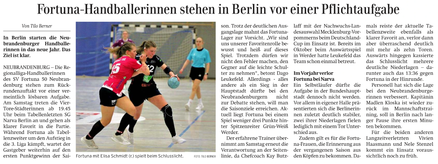 Nordkurier 09.01.2026: Fortuna-Handballerinnen stehen in Berlin vor einer Pflichtaufgabe