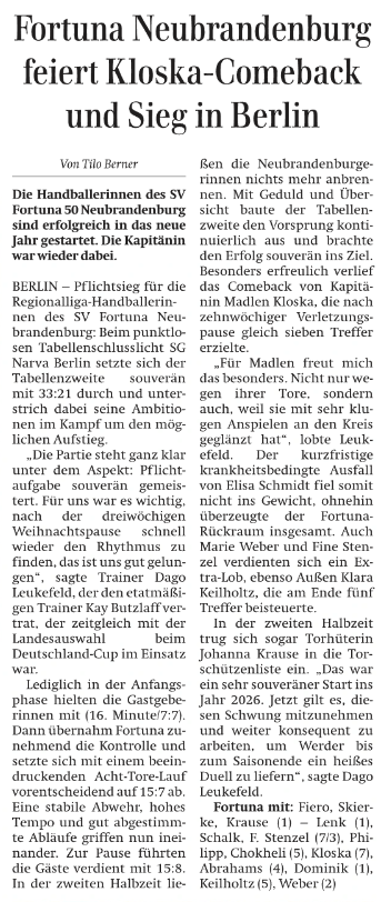 Nordkurier 12.01.2026: Fortuna Neubrandenburg feiert Kloska-Comeback und Sieg in Berlin