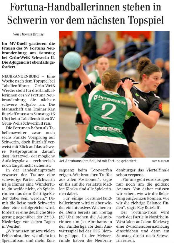 Nordkurier 20.02.2026: Fortuna-Handballerinnen stehen in Schwerin vor dem nächsten Topspiel