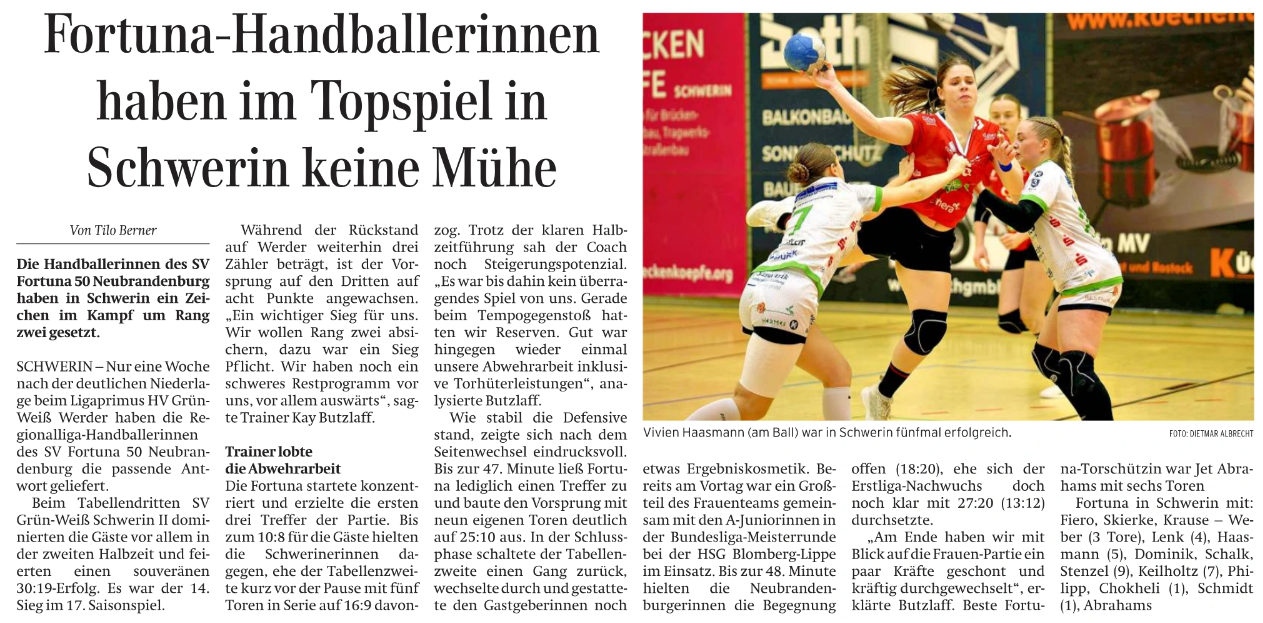 Nordkurier 24.02.2026: Fortuna-Handballerinnen haben im Topspiel in Schwerin keine Mühe