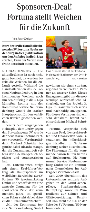 Nordkurier 01.04.2026: Sponsoren-Deal! Fortuna stellt Weichen für die Zukunft