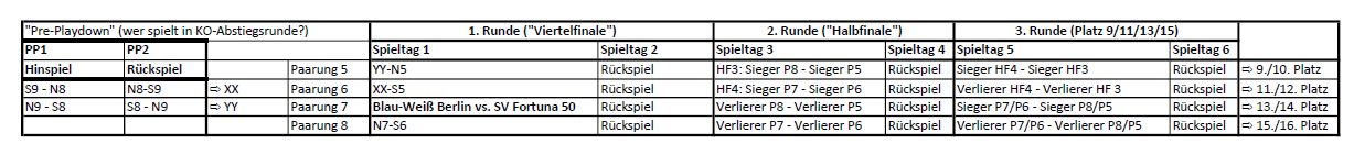 Neben dem SV Fortuna ´50 gehen der Bad Doberaner SV, der VfV Spandau sowie der BTV 1850 und die SG Narva Berlin aus der Nordstaffel in die Abstiegsrunde. Aus der Südstaffel müssen Blau-Weiß 1890 Berlin, der Grünheider SV, die SG OSF Berlin sowie die TSG Lübbenau und der HC Spreewald in die Abstiegsrunde. Dabei spielen Narva, der BTV, die TSG Lübbenau und der HC Spreewald die sogenannten Pre-Play-Downs.