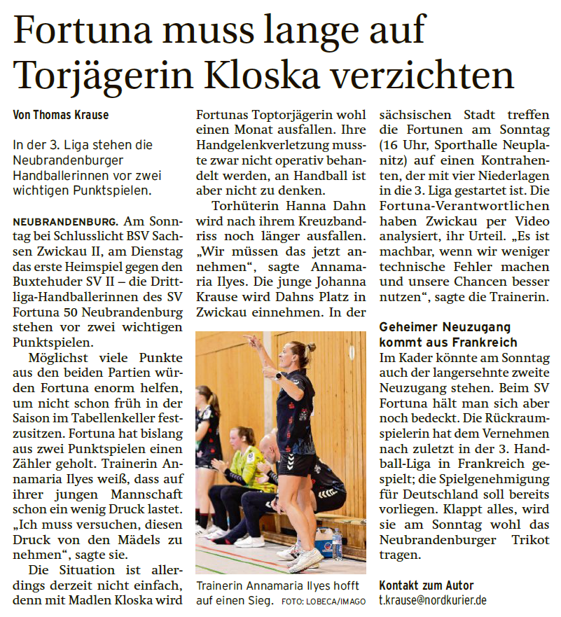 Nordkurier 29.09.2023: Fortuna muss lange auf Torjägerin Kloska verzichten