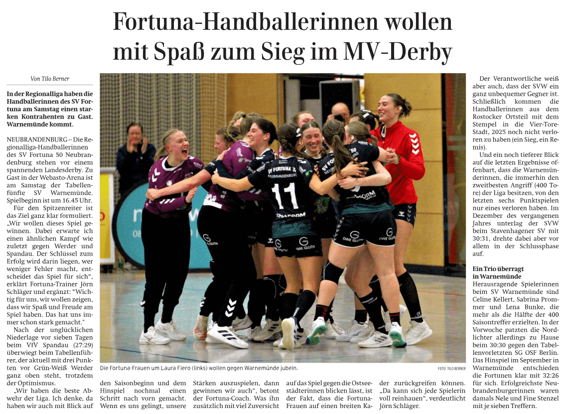 Nordkurier 24.01.2025: Fortuna-Handballerinnen wollen mit Spaß zum Sieg im MV-Derby