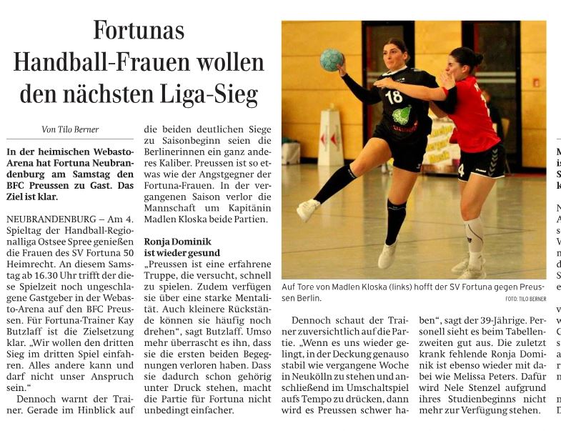 Nordkurier 11.10.2025: Fortunas Handball-Frauen wollen den nächsten Liga-Sieg