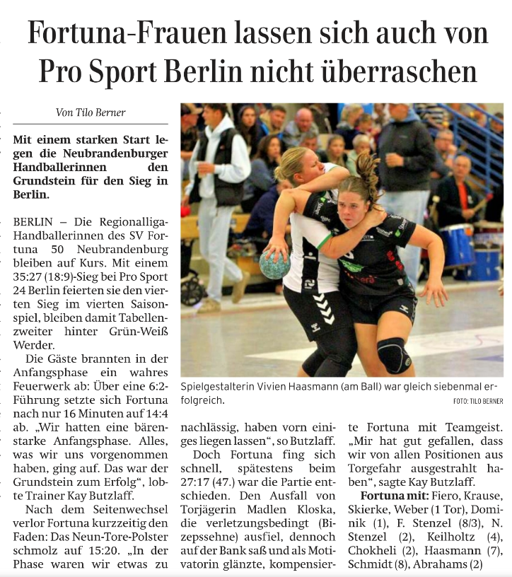 Nordkurier 27.10.2025: Fortuna-Frauen lassen sich auch von Pro Sport Berlin nicht überraschen