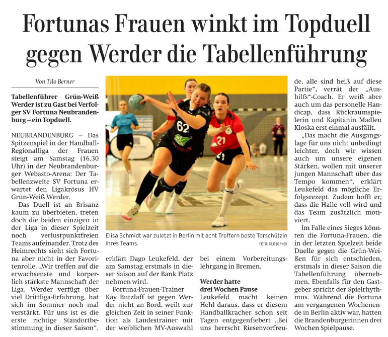 Nordkurier 30.10.2025: Fortunas Frauen winkt im Topduell gegen Werder die Tabellenführung