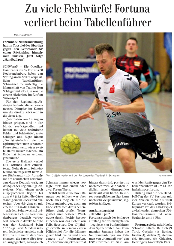 Nordkurier 17.11.2025: Zu viele Fehlwürfe! Fortuna verliert beim Tabellenführer