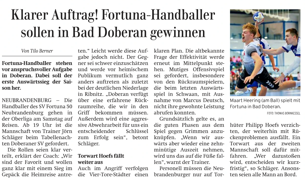 Nordkurier 28.11.2025: Klarer Auftrag! Fortuna-Handballer sollen in Bad Doberan gewinnen