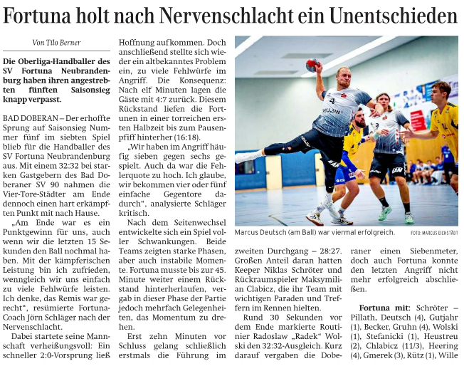 Nordkurier 01.12.2025: Fortuna holt nach Nervenschlacht ein Unentschieden