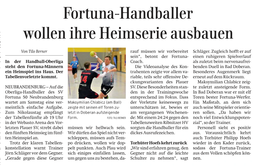 Nordkurier 05.12.2025: Fortuna-Handballer wollen ihre Heimserie ausbauen
