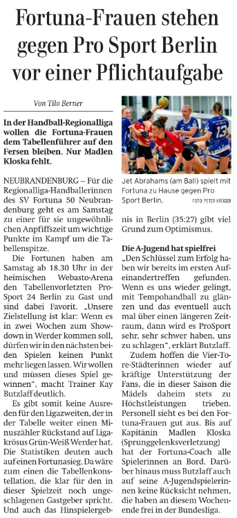 Nordkurier 30.01.2026: Fortuna-Frauen stehen gegen Pro Sport Berlin vor einer Pflichtaufgabe