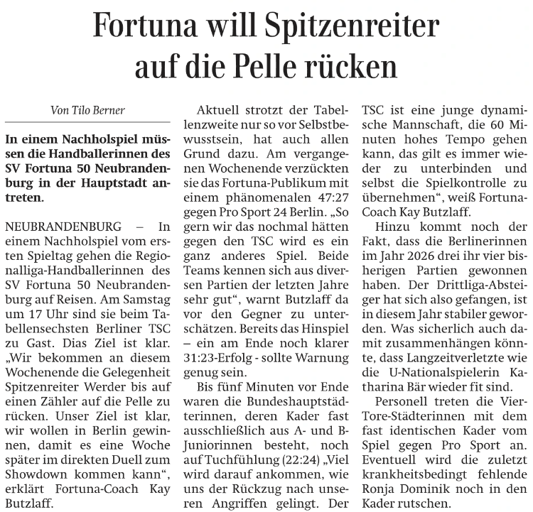 Nordkurier 06.02.2026: Fortuna will Spitzenreiter auf die Pelle rücken