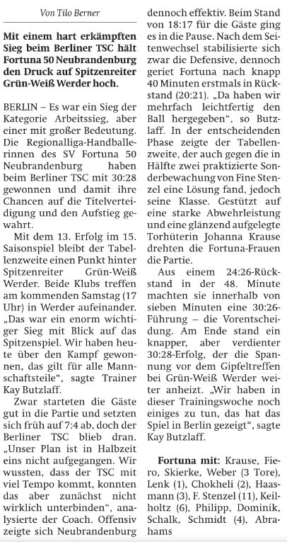 Nordkurier 09.02.2026: Fortuna-Handballerinnen bringen sich vor dem Topspiel in Stellung