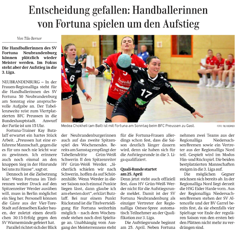 Nordkurier 06.03.2026: Entscheidung gefallen: Handballerinnen von Fortuna spielen um den Aufstieg