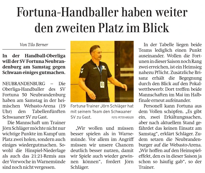 Nordkurier 13.03.2026: Fortuna-Handballer haben weiter den zweiten Platz im Blick